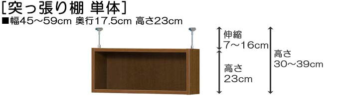 スペースにピッタリサイズでオーダー可能 オーダ突っ張り棚 奥行17.5cm×高さ30〜39cm×幅45〜59cm 幅は1cm単位で指定 標準棚板(厚さ1.7cm) 奥行17.5cm 高さ30〜39cm 幅45〜59cm お客様組立て 低ホルムアルデヒド