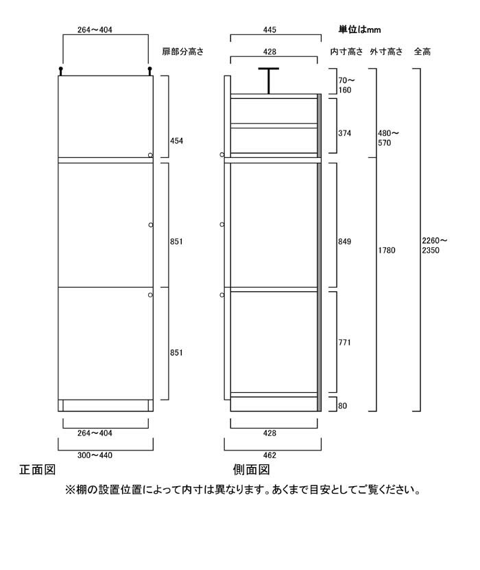防振つっぱり隙間収納 オーダー1cm単位 商品仕様 ■タイプ: 標準棚板(棚板厚さ1.7cm)タイプ ■棚板耐荷重: 10Kg ■外寸: 奥行46cm×高さ226〜235cm×幅30〜44cm (幅は1cm単位でオーダーできます) ■対応天井高:(2m26cm〜2m35cm) 226cm 227cm 228cm 229cm 230cm 231cm 232cm 233cm 234cm 235cm 伸縮式のつっぱり金具で高さ2m26cm〜2m35cmの天井に対応します (2m26cm 2m27cm 2m28cm 2m29cm 2m30cm 2m31cm 2m32cm 2m33cm 2m34cm 2m35cm) ■外寸(幅): 30cm 31cm 32cm 33cm 34cm 35cm 36cm 37cm 38cm 39cm 40cm 41cm 42cm 43cm 44cm ■棚板枚数 移動棚板:4 移動固定棚板:3 ■構成:本体…奥行46cm×高さ178cm×幅30〜44cm 突っ張り棚…奥行46cm×高さ41cm×幅30〜44cm 本体用扉…高さ170.2cm×幅30〜44cm 突っ張り棚用扉…高さ45.4cm×幅30〜44cm オーダー つっぱり隙間収納_ 商品詳細 本体 + 突っ張り棚 + 本体用扉 + 突っ張り棚用扉のセットです。