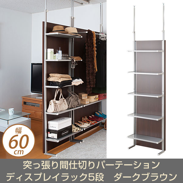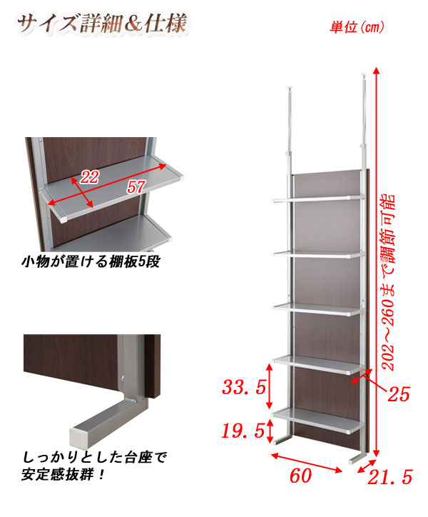 ■製品の仕様 フレーム:スチール(エポキシ粉体塗装)、ハンガー:スチール(メッキ仕上げ)、パネル:プリント紙化粧繊維板 ■商品サイズ/本体:(約)幅60×奥行25(脚部21.5)×高さ202-260cm、棚板:(約)幅57×奥行22cm、棚間隔 :(約)33.5cm、目隠し部高さ:(約)182cm ■耐荷重量/棚:(約)3kg ■商品重量/約18kg ■日本製 ■組立品(組立時間:約60分) ■関連商品 ・突っ張り間仕切りディスプレイラック5段 幅60cm(ホワイト) ・突っ張り間仕切りディスプレイラック5段 幅60cm(ナチュラル) ・突っ張り間仕切りディスプレイラック5段 幅60cm(ダークブラウン) ・突っ張り間仕切りディスプレイラック5段 幅90cm(ホワイト) ・突っ張り間仕切りディスプレイラック5段 幅90cm(ナチュラル) ・突っ張り間仕切りディスプレイラック5段 幅90cm(ダークブラウン) ※こちらの商品は受注生産品です。