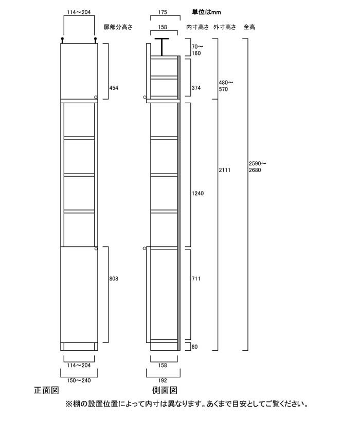防振対策隙間つっぱり壁面収納 棚移動可 商品仕様 ■タイプ: 標準棚板(棚板厚さ1.7cm)タイプ ■棚板耐荷重: 9Kg ■外寸: 奥行19cm×高さ259.1〜268.1cm×幅15〜24cm (幅は1cm単位でオーダーできます) ■対応天井高:(2m59cm〜2m68cm) 259cm 260cm 261cm 262cm 263cm 264cm 265cm 266cm 267cm 268cm 伸縮式のつっぱり金具で高さ2m59cm〜2m68cmの天井に対応します (2m59cm 2m60cm 2m61cm 2m62cm 2m63cm 2m64cm 2m65cm 2m66cm 2m67cm 2m68cm) ■外寸(幅): 15cm 16cm 17cm 18cm 19cm 20cm 21cm 22cm 23cm 24cm ■棚板枚数 移動棚板:4 移動固定棚板:4 ■構成:本体…奥行19cm×高さ211.1cm×幅15〜24cm 突っ張り棚…奥行19cm×高さ41cm×幅15〜24cm 本体用扉…高さ80.8cm×幅15〜24cm 突っ張り棚用扉…高さ45.4cm×幅15〜24cm オーダー 隙間つっぱり壁面収納_ 商品詳細 本体 + 突っ張り棚 + 本体用扉 + 突っ張り棚用扉のセットです。
